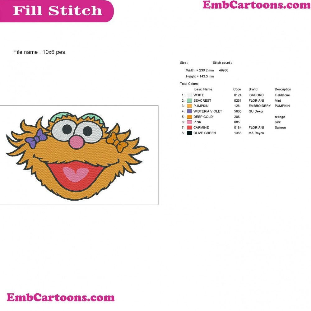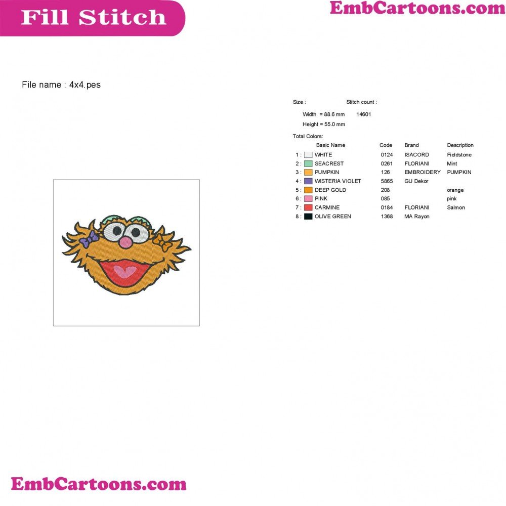 - Product Code: Zoe Face Smiley Sesame Street Embroidery Design